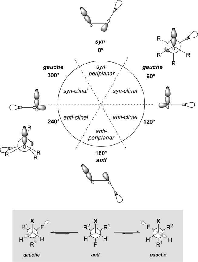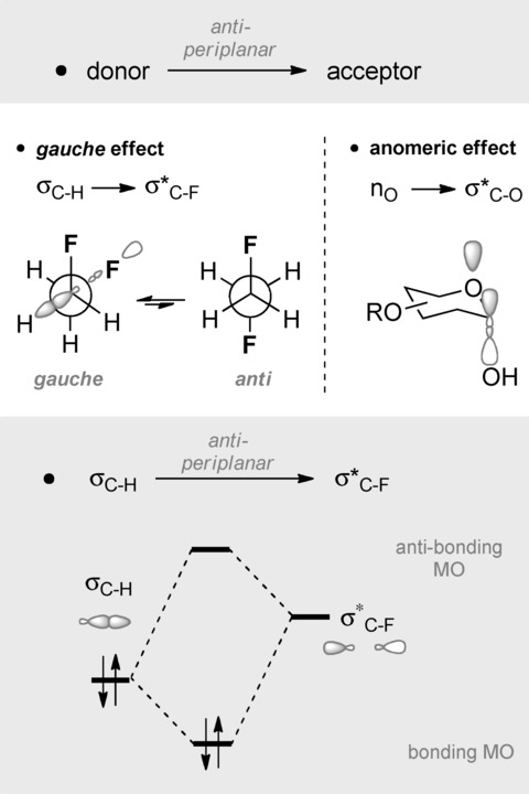 偶然发现的对立面是科学假设的培养和完善。独立地,这些策略继续以自己的能力塑造科学格局;然而,有意义的进步往往植根于两者。21960 年,在描述取代乙烷振动光谱的越来越多的文献基础上,Klaboe 和 Nielsen 报告了 1,2-二氟乙烷的红外和拉曼光谱。这些对固体、 不同温度下的液态和气态揭示了旋转异构体的混合物,从而得出反异构体和高什形式在气相中具有同等稳定性的结论。有趣的是,据报道,gauche 构象在液态和固态中占主导地位。在这份初步报告之后,Van Schaick等人进行的电子衍射研究确定,1,2-二氟乙烷在气相中的优选构象实际上是高什形的。这同时通过微波光谱6得到证实,其中ΦFCCF=73±4°的二面角得到了,并最终通过核磁共振耦合常数分析7和计算得到了证实。1,2-二氟乙烷的平衡偶极矩也已知,并显示出反温度依赖性(dμ/dT<0).这种异常构象行为的更全面图景是由于 Huber-Wälchli 和 Günthard 在氩基体中捕获不稳定的反构象异构体而产生的。到 1970 年代中期,许多小组已经使用最先进的技术仔细研究了 1,2-二氟乙烷的构象行为:当然,随着更复杂技术的出现,这些数据也在不断完善。接下来,为什么观察到这种构象偏好的问题是:这个谜团是通过与包含相邻电子对和极性键的结构可比系统进行类比来解决的。从教学上讲,这可以被认为是 [供体→受体] 相互作用,因此,它与 H2O2,中的 n→σ* 相互作用或碳水化合物固有的著名异头效应 (nO→σC−O*) 密切相关(图 1)。16 后一种过程在氟胺中起作用, 正如 Dunitz 及其同事解决氟甲胺 (nN→σC−F*) 异头效应的立体电子方面的研究所证明的那样。17 从概念上讲,这种“供体-受体”框架扩展到供体π系统,例如氟化苄,以涵盖 π→σC−F* 相互作用。虽然 1,2-二氟乙烷中键合结构的准确表示要复杂得多,因此不会在这里讨论, 该模型经受住了时间的考验。Wolfe 的早期评论将 gauche 效应形式化为“一种采用相邻电子对和/或极性键之间具有最大数量的 gauche 相互作用的结构的趋势”,因为这种安排最终允许最大数量的供体-受体相互作用。随后,通过考虑σC−H→σC−F*代替nO/N→σC−X*,得出广义模型,从而描绘出围绕1,2-二氟乙烷的中心C−C键旋转产生的违反直觉的最大值和最小值。