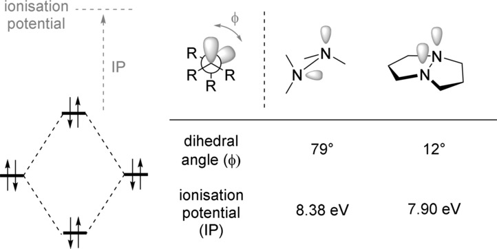 由于分子内重叠取决于轨道的相对取向,这种相互作用所产生的影响与分子的构象密切相关。因此,取代基之间的二面角(Φ)在立体电子效应的任何讨论中是至关重要的。当相邻的两个取代基的构型为二面角180°(反)时,相应的轨道重叠最大。当Φ接近90°时,相互作用减弱。继续旋转到Φ=0°(syn)时,相互作用再次增加,但永远不会达到180°的大小。0°±30°的角度称为同平面角度,180°±30°的角度则称为反平面角度。推而广之,60°的角度称为格栅(60°)或同心角(60°±30°)。图4显示了在各种二面体角度下的轨道相互作用示意图,以及用于描述邻近群组构象关系的适当术语。N.B.:氟量规效应指的是两个C−F键之间的向斜关系,而立体电子模型指的是C−H和C−F基团的反平面对齐(180°,反)。根据轨道的占用情况(填充或空置),相互作用可以是稳定的或不稳定的。在立体电子计和阳极效应中,稳定超共轭相互作用(空轨道和填充轨道之间)是构象行为的基础。然而,两个填充轨道以破坏稳定的方式相互作用的情景也有充分的文献记载。一个这样的例子是结构相关的肼衍生物,四甲基肼和1,5-二氮杂双环【3.3.0】辛烷的比较(图5)。由于在无环方案中N-N键的旋转不受阻碍,非键电子对(nN)可以被安排在一个几乎垂直的方式(二面角Φ=79°),这样的不稳定性被减轻。在刚性双环结构中,非键电子对被迫相互作用(Φ=12°);这种不利的相互作用的后果表现在电离电位显着下降(IP=7.90 eV vs 8.38 eV)。
