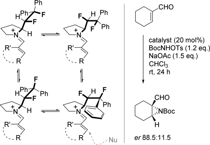 将1,2-二氟乙基单元【−CHF−CHF∗】战略性地融入功能性分子中,在有机催化和肽设计领域有着特别的应用(图6和图7)。由于所得构象必然使两个化学惰性的小氟原子靠近,这成为控制C2单元上额外基团的相对空间定位的强大手段。莫尔纳尔等人最近的一项研究利用连续的氟手性效应,在亚胺离子催化中实现了非环状构象控制(图6)。通过在吡咯烷核心的亲核胺基附近有策略地安置一个构型明确的氟中心,同时利用氟-氟和氟-亚胺离子手性效应24k,可以预先安排整个系统。这使得对4个键的构象控制成为可能;这一策略已在环己烯醛的对映选择性偶氮化反应中得到应用。