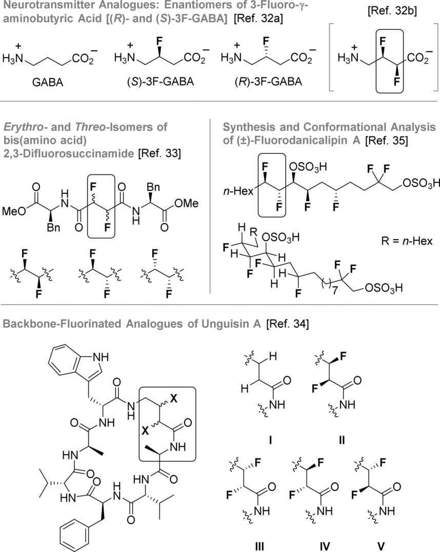 1,2-二氟乙烯单元能够影响各种复杂度的环状和无环肽的构象,这是在分子设计中使用氟构象效应的一个有说服力的论据。特别引人注目的是能够创建构象限制的γ-氨基丁酸(GABA)类似物,对系统的空间影响最小(图7,上)。由于哺乳动物中枢神经系统中主要的兴奋性神经递质是构象不稳定的,β-氟胺和邻近的二氟基序提供了探索离散构象的生物有效性的可能性,从而发现在医学上的转化应用。据报道,通过在1,2-二氟乙烯单元内定义相对立体化学关系,调节构象行为,适用于1,2-二苯基乙烷和2,3-二氟琥珀酸衍生物的红外和三亚非对映异构体(图7,左中)。这一概念在微妙改变结构复杂的环状肽乌骨素A的构象行为方面得到了极大的利用(图7下图)。最近,报道了氯磺脂丹尼卡林A的氟化类似物的全合成(图7右中)。基于J的邻近二氟基团构象分析与氟量规效应一致。