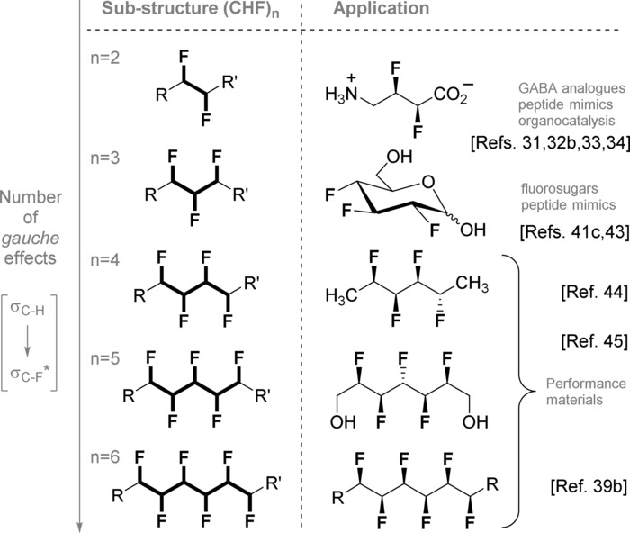 对于多支链氟代烷烃(CHF)n, 延伸1,2-二氟乙烯单元【−CHF−CHF∗】已被证明是一种有效的策略,用于设计具有前所未有的物理特性的有机高性能材料(图8)。这些杂化体系保留了母体烃固有的许多特性,但具有可调节构象和电子特性的优势,往往能产生惊人的效果。最近,O'Hagan及其同事创建了一系列线性烃-特氟龙®}杂化物(CHF)n(图8)。这些材料的整体构象由各中心的相对立体化学关系所决定,从而形成了多样但定义明确的立体异构体。初步的物理数据已经令人瞩目地展示了环状及非环状多支链氟代烷烃在分子设计中的潜力。最近,已确认环状、面极化的全顺式1,2,3,4,5,6-六氟环己烷具有迄今已知有机材料中最大的偶极矩。 对该体系的NBO键合分析证实了超共轭相互作用(如支撑手性效应的超共轭作用)的贡献,尽管其程度不及氟原子的孤对电子色散。