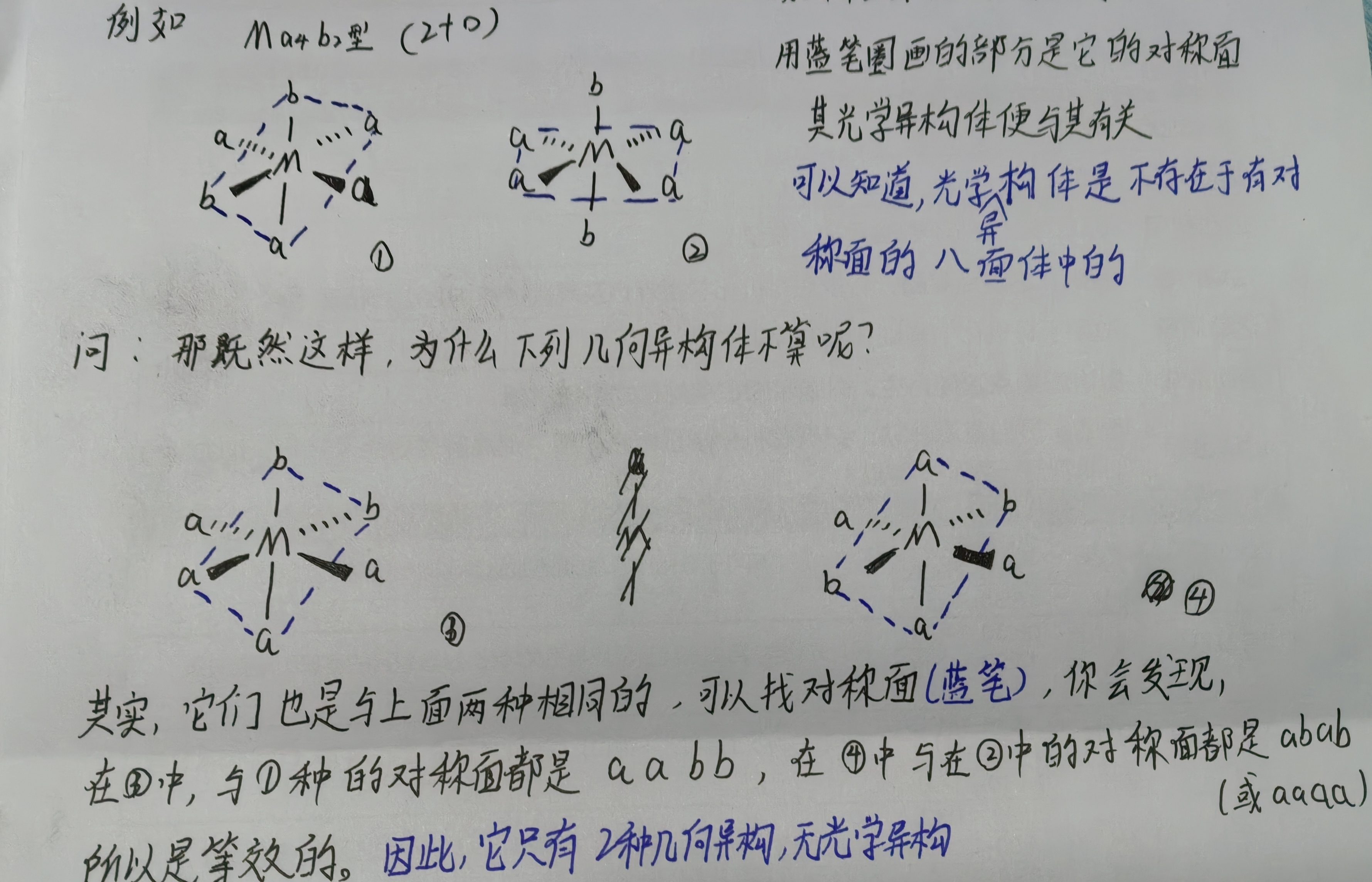 1.几何异构体:主要看键连关系 2.光学异构体:在几何异构体的基础上,寻找它的对称面、对称中心或4次映轴,如果有,那么它就没有光学异构体